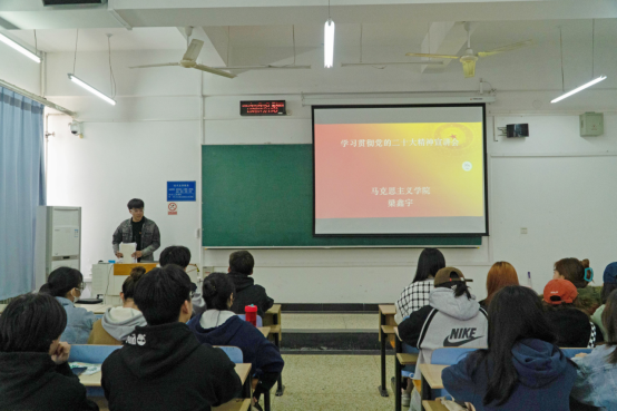 为深入学习贯彻党的二十大精神,3月16日,太阳成集团tyc234cc邀请我校马克思主义学院宣讲团成员梁鑫宇宣讲党的二十大精神。学院专职组织员郭鹤男主持,部分学生代表聆听了宣讲。