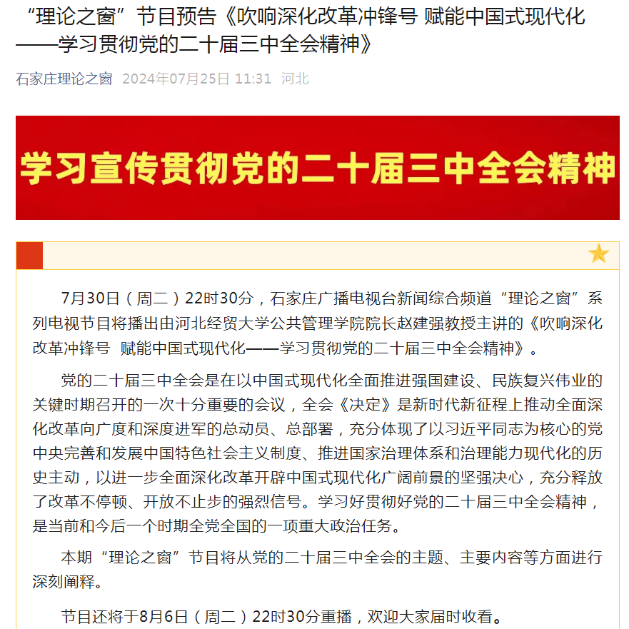 赵建强院长受邀石家庄“理论之窗” 主讲:吹响深化改革冲锋号 赋能中国式现代化——学习贯彻党的二十届三中全会精神