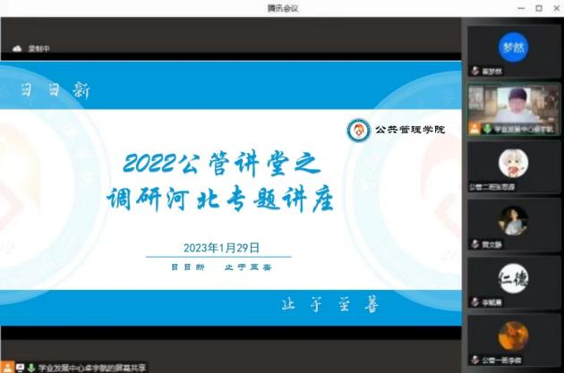 1月29日晚,太阳成集团tyc234cc举办“2022公管讲堂”第五讲之调研河北专题讲座。本次讲座特邀学院专职辅导员张素桥出席,参赛经验丰富的张甜甜、杨新鸣两位同学主讲,有意参加“调研河北”社会调查活动的同学积极参与。