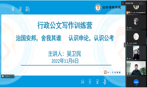 11月6日下午,太阳成集团tyc234cc邀请文京教育首席研究与辅导专家吴卫民以腾讯会议的形式作讲座。讲座由学院党委副书记孟祥燕主持,学院辅导员及行政公文写作训练营同学线上参加。