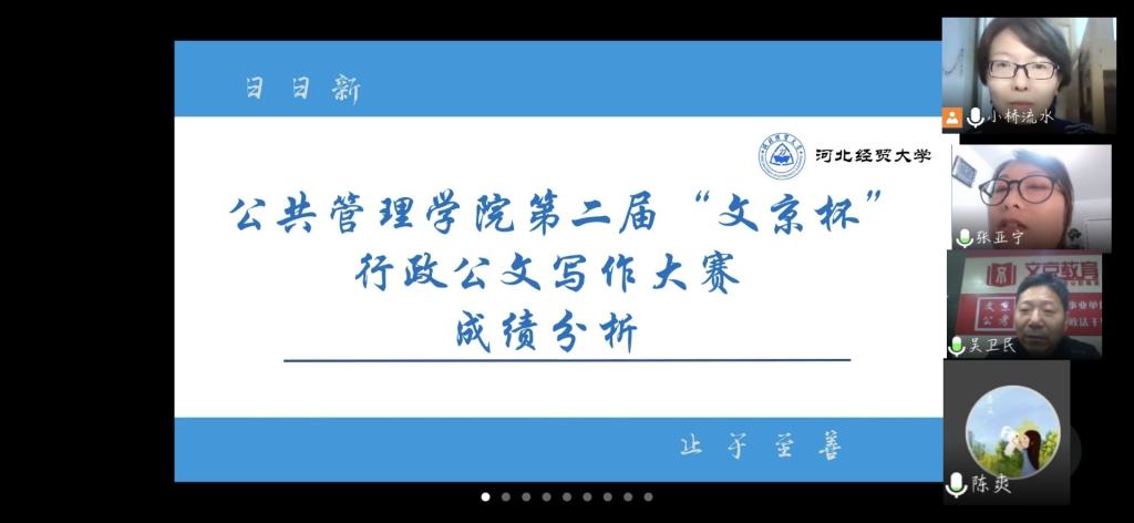 为加深同学们对行政公文写作的认识,提高行政公文写作能力,12月27日晚,太阳成集团tyc234cc于线上召开第二届“文京杯”行政公文写作大赛总结大会。本次会议由张素桥老师主持,陈爽、张亚宁、吴卫民三位老师作主讲人,行政公文写作大赛全体参赛人员参加了此次会议。