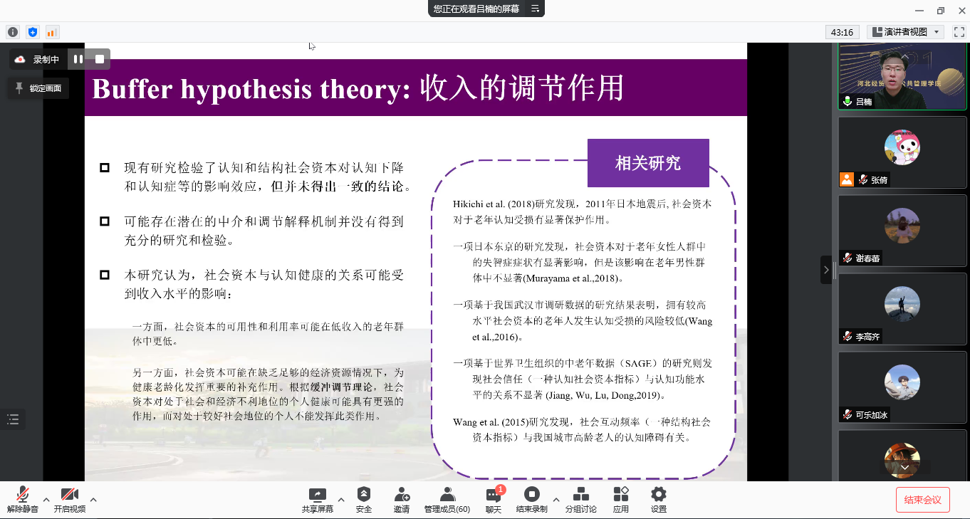 吕楠围绕健康老龄化视域下农村老年人照护与社会资本整合,以及老年人认知能力和精神健康,聚焦我国农村地区老年人口社会资本与认知功能的关系。并基于主持的国家社科重点项目调研数据,为师生们介绍了我国农村地区老年人口社会资本、社区环境与精神健康的关系研究。最后阐述了在乡村振兴和城乡公共服务均等化进程中,农村老年人的养老需求、社会资本特点以及社会服务的可行性路径。