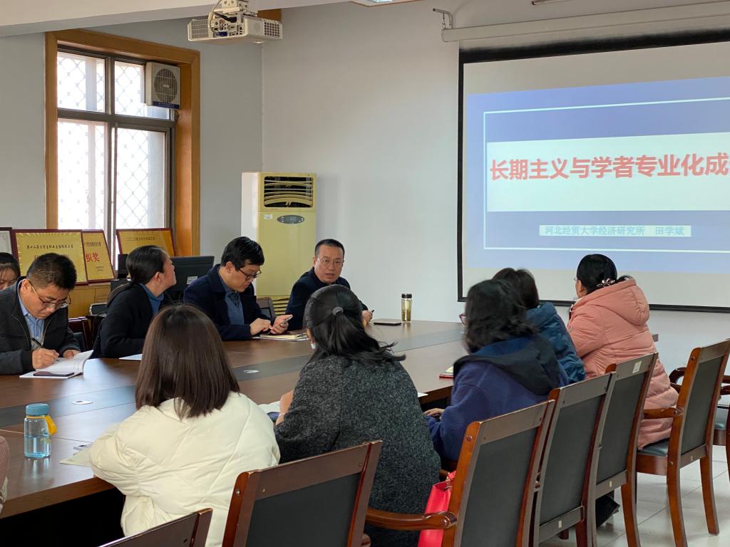 12月13日下午,太阳成集团tyc234cc邀请我校经济研究所所长、京津冀一体化发展协同创新中心专职副主任田学斌教授在学院会议室作题为“长期主义与学者专业化成长”的学术讲座,学院部分教师及研究生共50余人到场聆听。