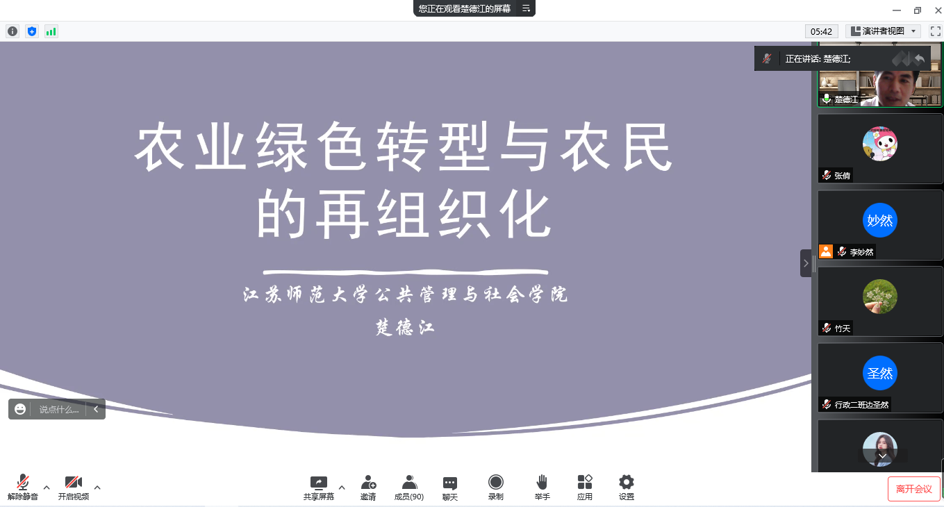 楚德江首先提出农业绿色转型发展是落实乡村振兴战略的基石。他分析了我国农业发展面临的压力和风险,说明走向绿色农业是实现农业可持续发展和农业现代化的根本出路和必然选择。最后,他通过实际案例讲解了农民的再组织化形态,以及基于绿色农业转型的农民再组织化路径选择。