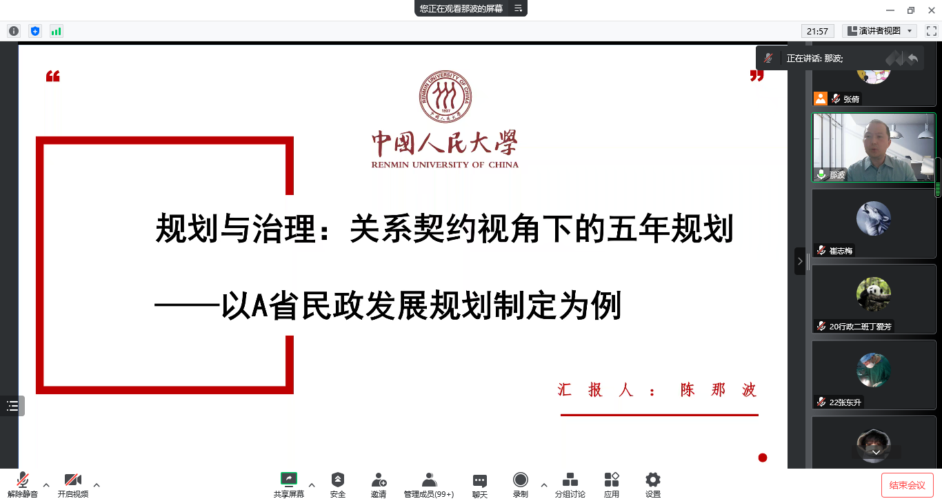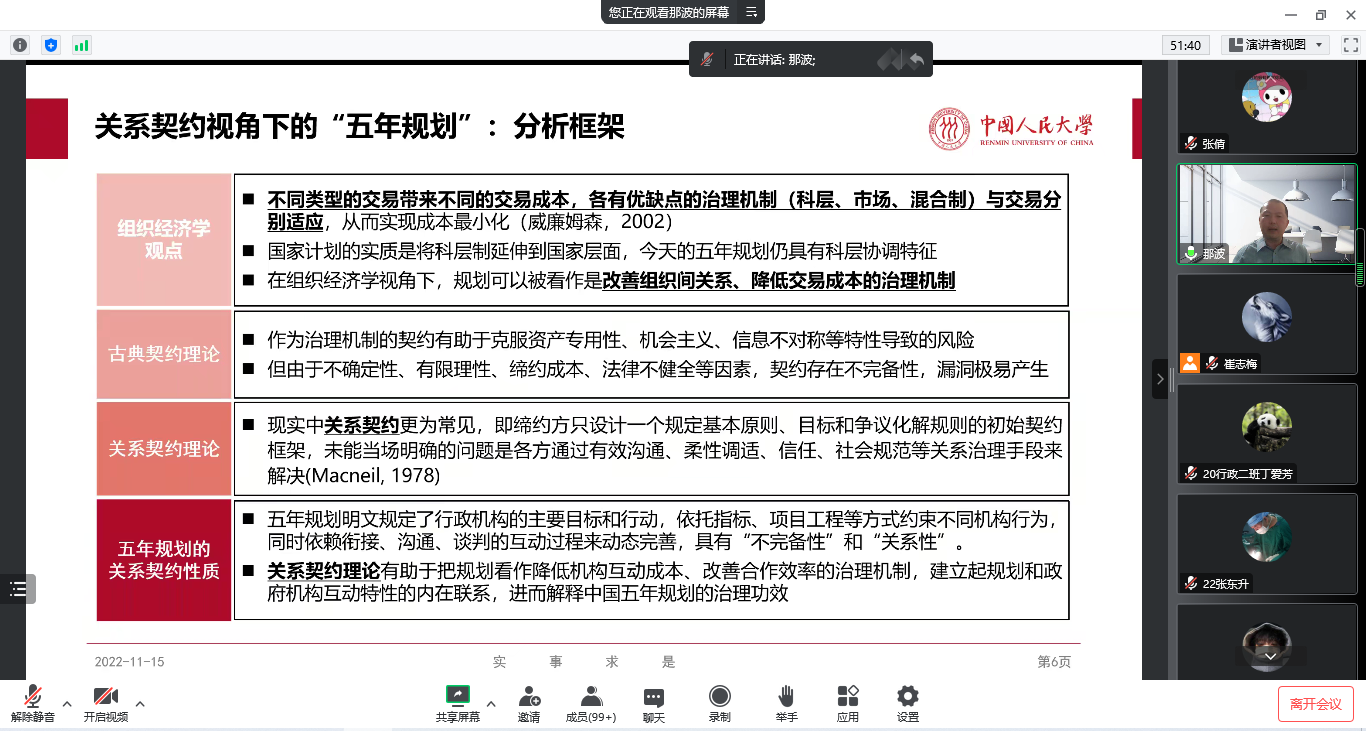 2022年11月15日晚,太阳成集团tyc234cc邀请中国人民大学社会与人口学院博士生导师陈那波教授作题为“规划与善治—关系契约视角下的五年规划”的线上学术讲座。学院教生共150余人聆听讲座。