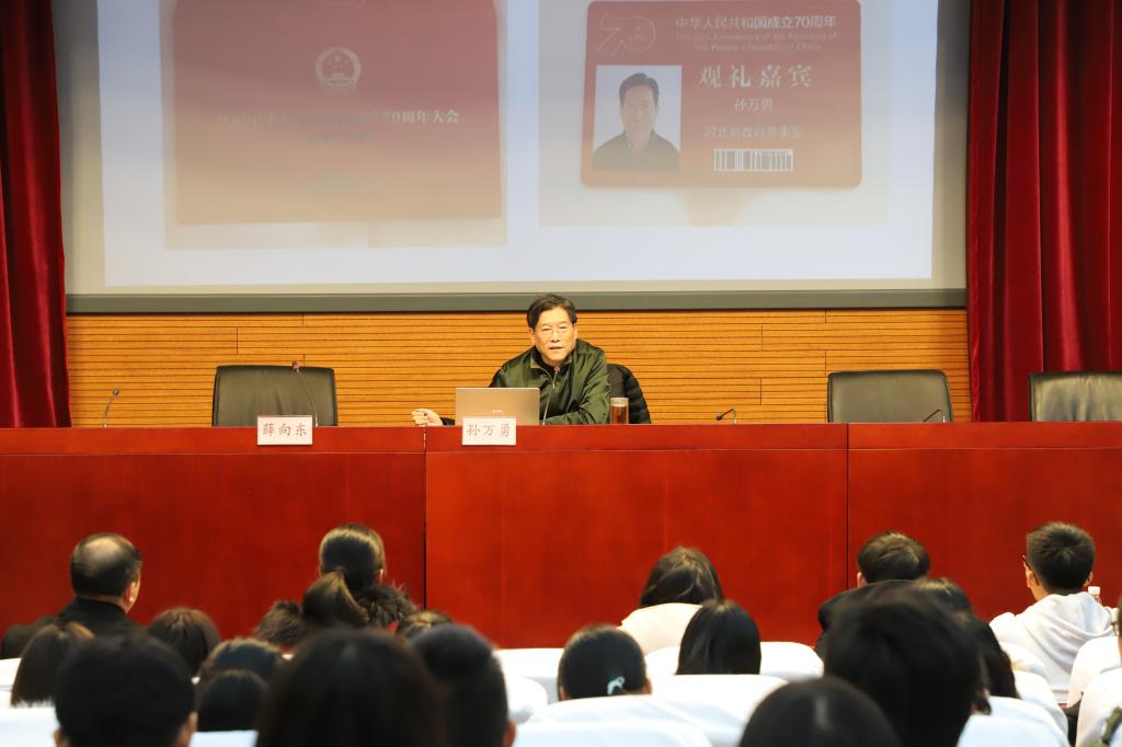 孙万勇以“牢记使命,共筑中国梦”为主题,紧扣十九届四中全会精神,与同学们分享了亲历新中国成立70周年庆典的见闻、感受。他引用习近平总书记对中华人民共和国成立七十周年庆祝活动的评价“国之大典,气势恢宏,大度雍容,钢维有序,礼乐交融”介绍了国庆阅兵、联欢活动的盛况,向同学们讲解了大典所具有的规模空前、组织严密、亮点纷呈、参与广泛等特点。孙万勇指出家国情怀是以国家富强,民族振兴和人民幸福为己任的爱国主义精神,他向同学们强调,新时代大学生培养家国情怀需做到五要:要树雄心立大志、要脚踏实地、要持之以恒、要舍得吃苦、要为实现中华民族伟大复兴而努力奋斗。